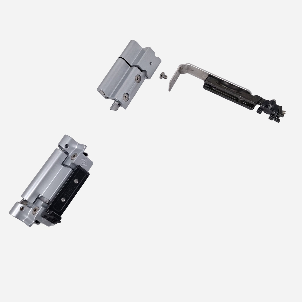 Charnière en extrudé et zamac, contreplaques et vis ; bras avec levier, vis et goujons en acier inox ; corps en zamac. Kit charnières pour vantail juxtaposé Charge maximale 100 Kg.