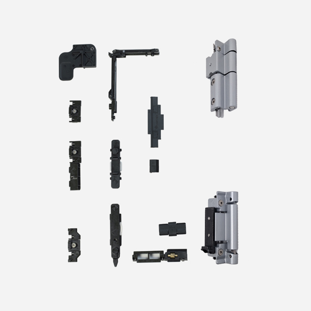 Charnière en aluminium extrudé et zamac ; renvoi d'angle, terminaux et contreplaques en zamac, plaquettes et vis en acier inox. Kit base maneuvre logique avec anti fausse manoeuvre sur la crémone. Charge maximale 100 Kg. En combinaison avec les bras art. 3402.2X.