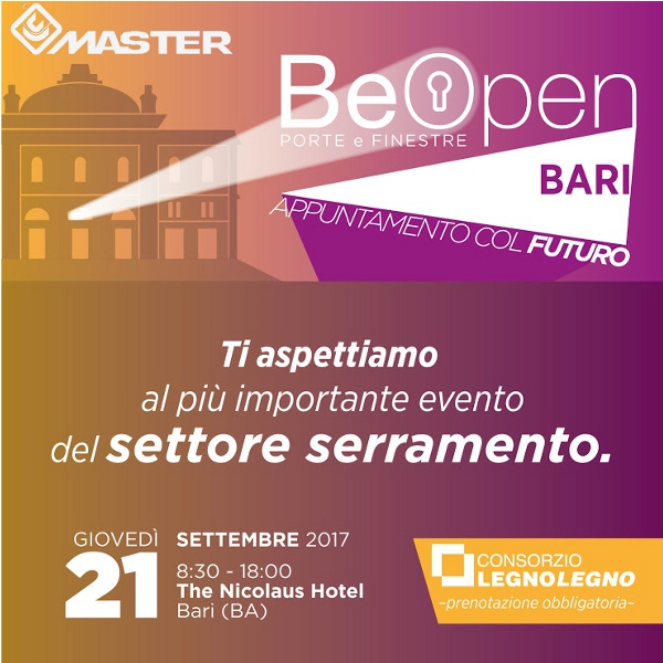 BeOpen è il ciclo di eventi in tour per tutta la penisola, dedicato ai produttori di serramenti italiani, nato dall’esperienza positiva degli Open Day del Consorzio LegnoLegno. Si tratta di giornate dedicate alla crescita professionale degli operatori, basate su momenti formativi con tematiche importanti come il marketing e le tecniche di vendita o il confronto tecnico sulle ultimissime innovazioni di prodotto. La manifestazione farà tappa al Nicolaus Hotel di Bari, giovedì 21 settembre prossimo.La formula prevede come sempre la presenza di un’area promozionale e di consulenza curata dalle aziende partner. Tra queste la Master, che all’interno del proprio corner espositivo con l’apporto dello staff tecnico, presenterà le ultime novità di prodotto sviluppate per il 2017. Per partecipare gratuitamente all’evento che si terrà dalle ore 9 alle 18 è necessario iscriversi compilando l’apposito form on line (clicca qui). Per ricevere qualsiasi tipo di informazione è possibile scrivere a maela.montanari@legnolegno.it. ISCRIVITI e PARTECIPA GRATUITAMENTE