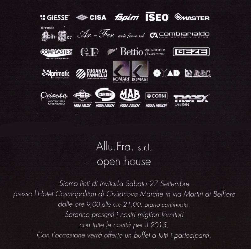 Sabato 27 Settembre presso l’Hotel Cosmopolitan di Civitanova Marche si terrà l’Open House organizzato dalla Allu.Fra. S.r.l., importante azienda della zona per la commercializzazione di accessori per serramenti in alluminio e ferro. Più di 20 aziende leader del settore esporranno le proprie novità di prodotto negli spazi appositamente allestiti nell’area meeting del Cosmopolitan Hotel. La Master parteciperà all’iniziativa con i propri referenti di zona Adriano Carpino e Ciro Perrino per far conoscere le principali novità del 2014 come: WEEN il meccanismo anta ribalta con portata sino a 160 kg, che contribuisce all’acquisizione di crediti LEED e WiCloud, il sistema intelligente ed invisibile per l’automazione della finestra installabile su infissi in alluminio ed in legno.
