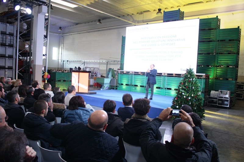 Venerdì 12 dicembre scorso, abbiamo vissuto un’importante giornata di condivisione e di confronto. Tutti i dipendenti dell’azienda sono stati protagonisti di un fondamentale momento di crescita per la nostra organizzazione: abbiamo messo al centro i valori, quelli che da sempre ci guidano e ci consentono di pensare ogni giorno ad un futuro fatto di solidità e di sviluppo. Ma abbiamo anche celebrato l’impegno e la dedizione di alcuni dei nostri colleghi e riso per l’incontenibile simpatia di Uccio De Santis, ospite speciale dell’evento. Qualità per la soddisfazione del cliente, innovazione e miglioramento continuo, etica e crescita sostenibile, collaborazione ed entusiasmo, valorizzazione e rispetto delle persone: sono questi i valori sui quali ognuno di noi è stato chiamato ad esprimersi. “In 20 anni il mondo della finestra è cambiato molto velocemente: comfort, automazione, risparmio energetico e sostenibilità ambientale sono i principi cardine intorno ai quali si evolverà il serramento del futuro”, sono state le parole del nostro direttore generale Michele Loperfido. “E se il mondo cambia anche noi dobbiamo cambiare”, ha continuato il co-direttore Celeste Vitte. “Abbiamo dato e daremo sempre più ascolto alle proposte di miglioramento di ognuno di voi, perché tutti insieme dobbiamo continuare a impegnarci con passione nel fornire soluzioni innovative per vivere il comfort, e fare di questo principio un credo che diventi pilastro ed orgoglio della nostra identità.”